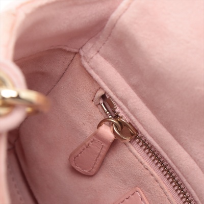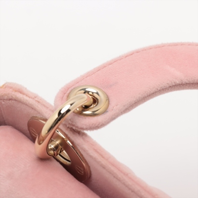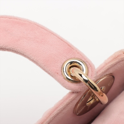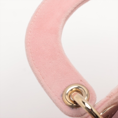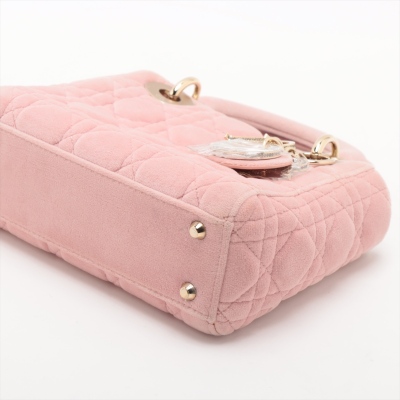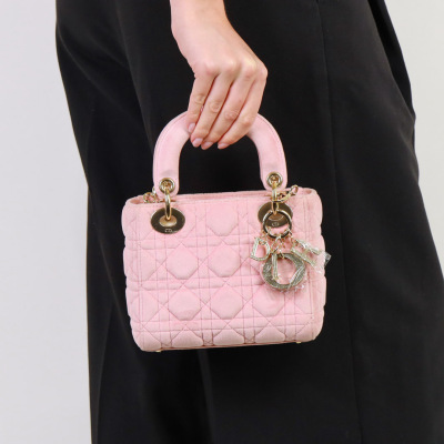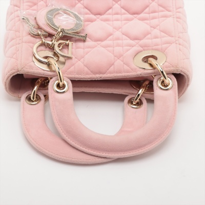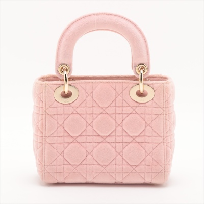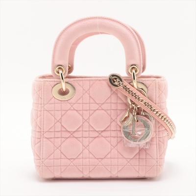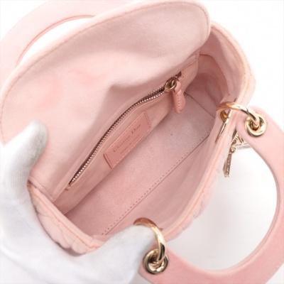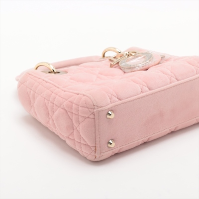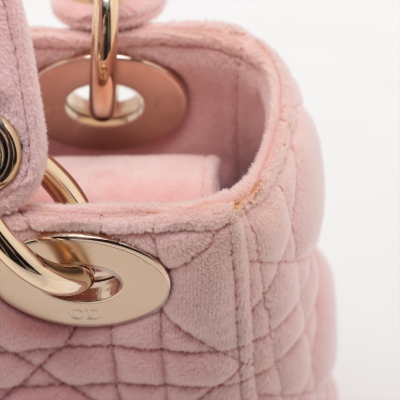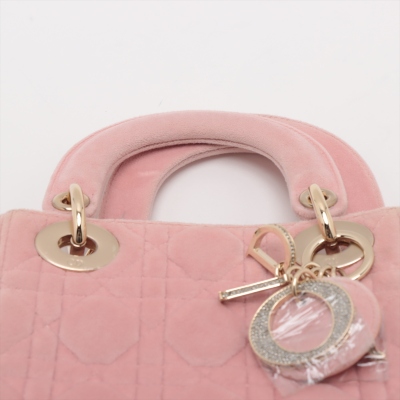 Christian Dior mini Lady Dior handbag in light pink velvet with Cannage stitching. Featuring gold-toned hardware, 'DIOR' charms decorated with faux diamonds, and detachable chain with leather pad strap. The flap on top opens to a pink microfibre interior with a zipper pocket. Approximate dimensions: 17cm(L) x 14cm(H) x 7cm(D), handle drop 7cm, strap drop 58cm. Accompanied by Dior dustbag. With Entrupy Certificate of Authenticity. (Pre-owned)