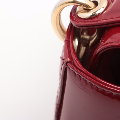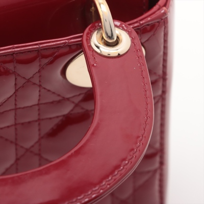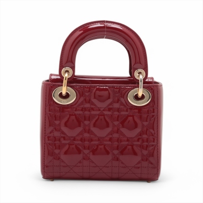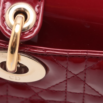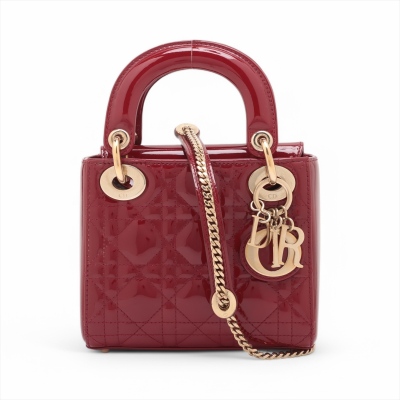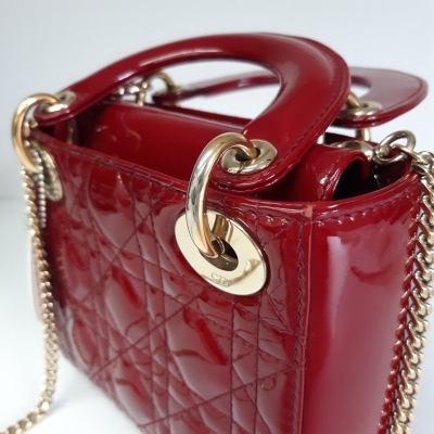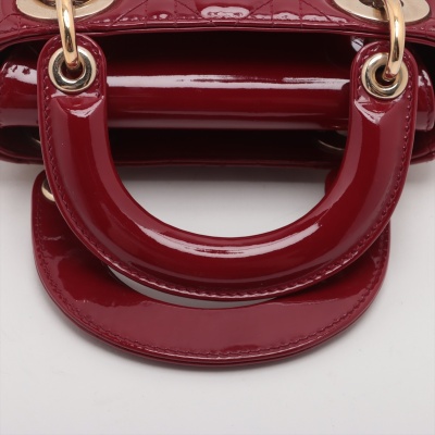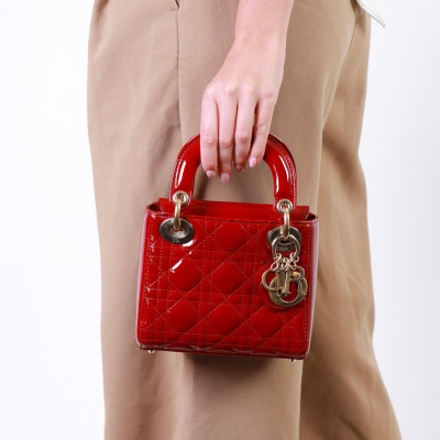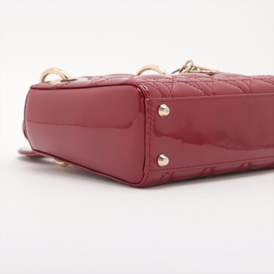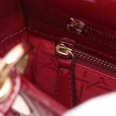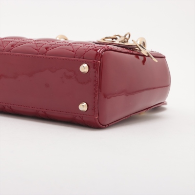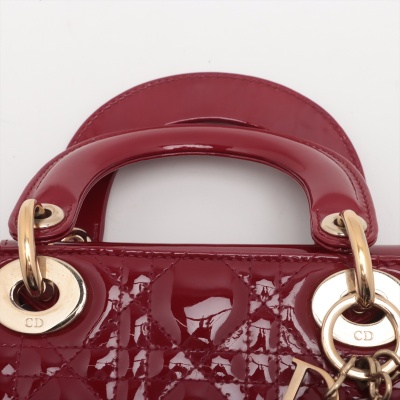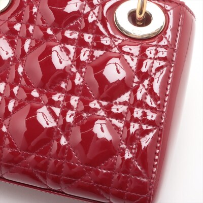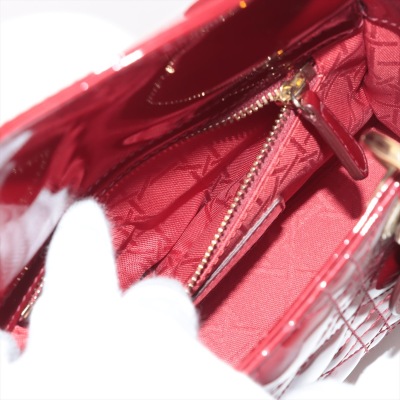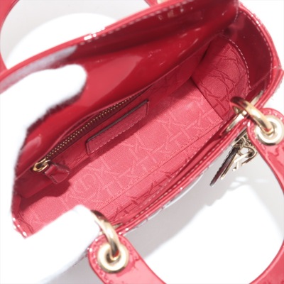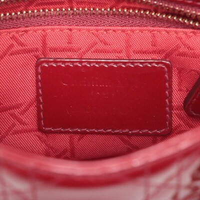 Christian Dior mini Lady Dior handbag in red patent leather with Cannage stitching. Featuring gold-toned hardware, 'DIOR' charms at front and detachable chain strap with leather shoulder pad. The flap top opens to a red logo-printed textile interior with a zipper pocket. Approximate dimensions: 17cm(L) x 14cm(H) x 7cm(D), handle drop 6cm, strap drop 59cm. With Entrupy Certificate of Authenticity. (Pre-owned)