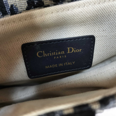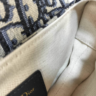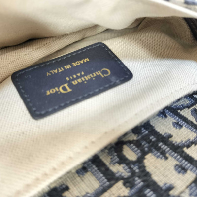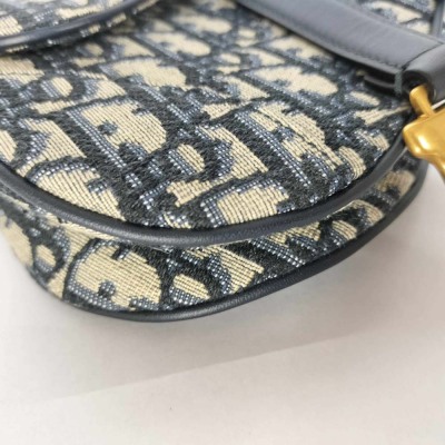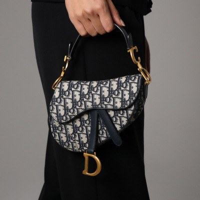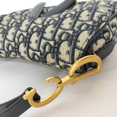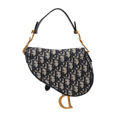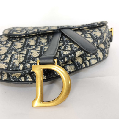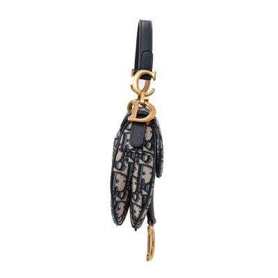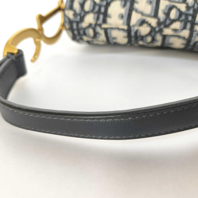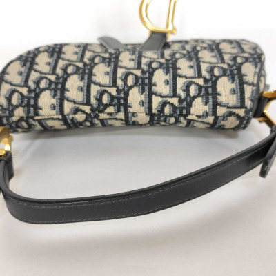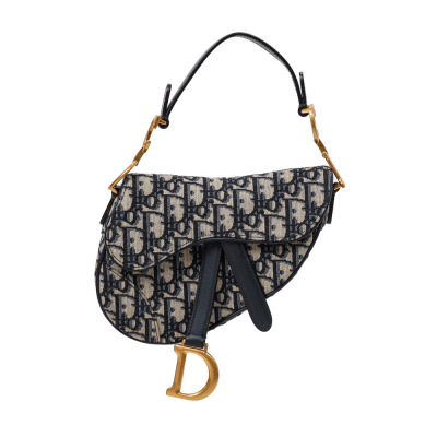 Christian Dior Mini Saddle Bag in navy blue Dior oblique canvas with navy leather trims (circa: 2020). Featuring antique gold-toned hardware, exterior rear pocket, leather handle with 'CD' signature logo. The 'D' stirrup strap with magnetic closure opens to a beige textile interior. Approximate dimensions: 18cm(L) x 14.5cm(H) x 5cm(D), handle drop 12cm. With Entrupy Certificate of Authenticity.