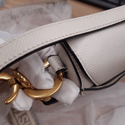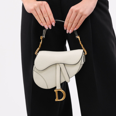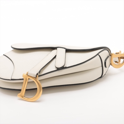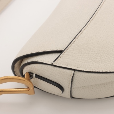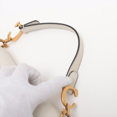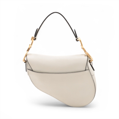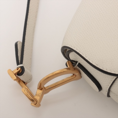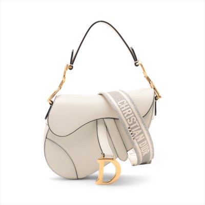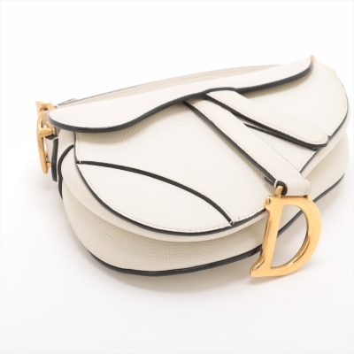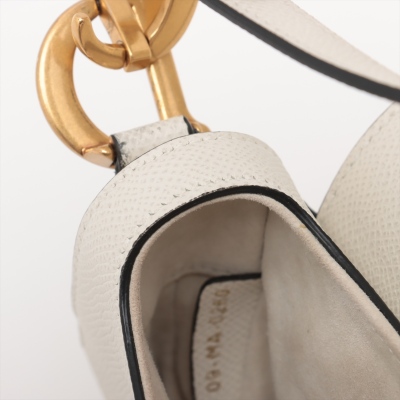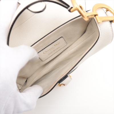 Christian Dior mini Saddle bag in white grainy leather. Featuring gold-toned hardware, exterior rear pocket, handle with 'CD' signature logo, and a detachable canvas shoulder strap. The 'D' stirrup strap with magnetic closure opens to a matching white microfibre interior. Approximate dimensions: 17.5cm(L) x 15.5cm(H) x 5cm(D), handle drop 12cm, and shoulder drop: 62cm, adjustable. With Entrupy Certificate of Authenticity. (Pre-owned)