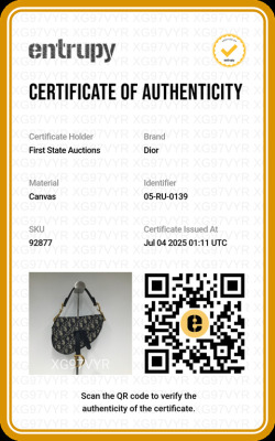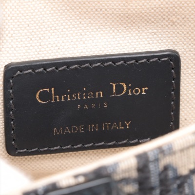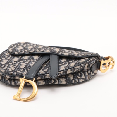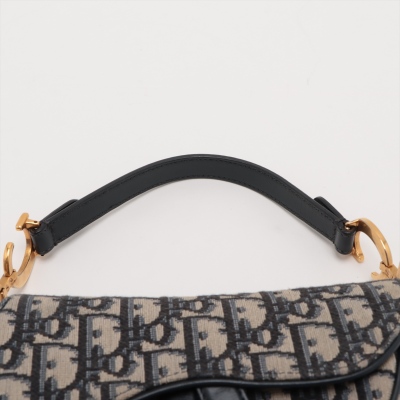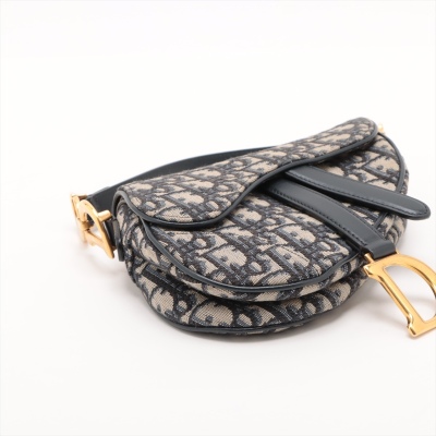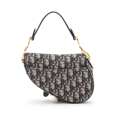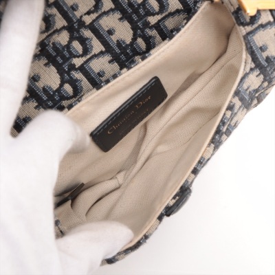 Christian Dior mini Saddle Bag in beige and navy Dior Monogram canvas with leather trims. Featuring antique gold-toned hardware, exterior rear pocket, leather handle with 'CD' signature logo. The 'D' stirrup strap with magnetic closure opens to a beige textile interior. Approximate dimensions: 18cm(L) x 14.5cm(H) x 5cm(D), handle drop 12cm. With Entrupy Certificate of Authenticity. (Pre-owned)