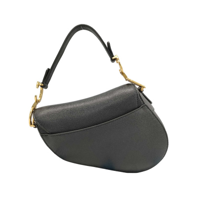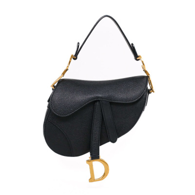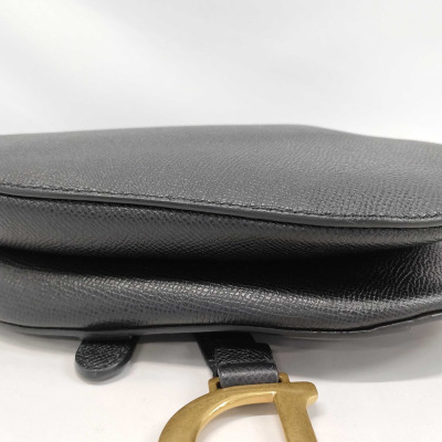 Christian Dior mini Saddle bag in black grained calfskin leather (Circa: 2021). Featuring an exterior pocket at the back, gold-tone hardware, 'D' signature on the strap, and a front flap with magnetic closure. This opens to a black suede-lined interior. Approximate dimensions: 18cm(Top-L) x 14cm(H) x 4cm(D), 12cm handle drop. With Entrupy Certificate of Authenticity.