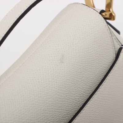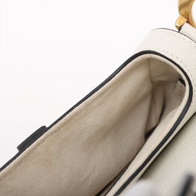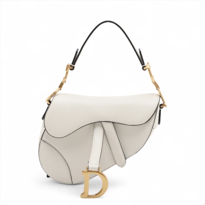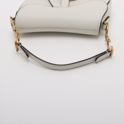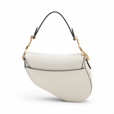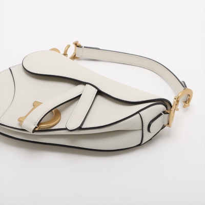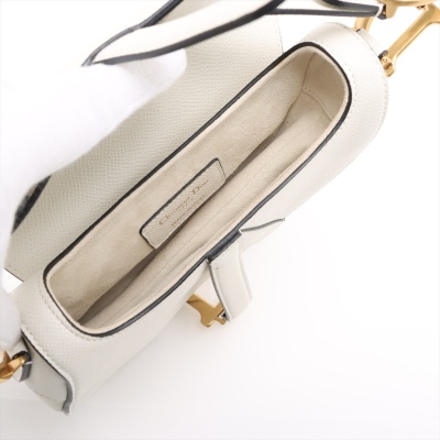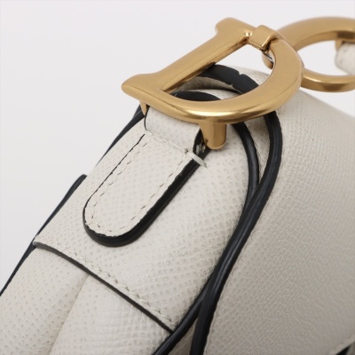 Christian Dior mini Saddle bag in white grainy leather and with black leather trims (year 2020). Featuring gold-toned hardware, exterior rear pocket, handle with 'CD' signature logo on each side. The 'D' stirrup strap with magnetic closure opens to a matching white microfibre interior. Approximate dimensions: 17.5cm(Top-L) x 15.5cm(H) x 5cm(D), handle drop 12cm, and shoulder drop: 62cm, adjustable. With Entrupy Certificate of Authenticity. (Pre-owned)