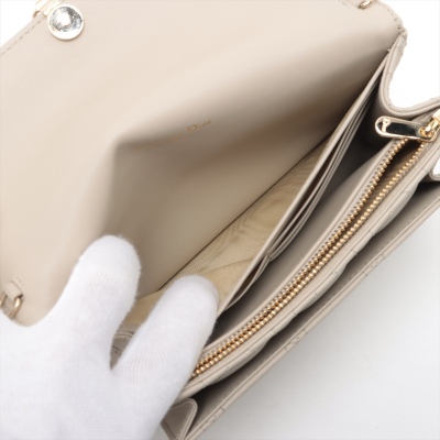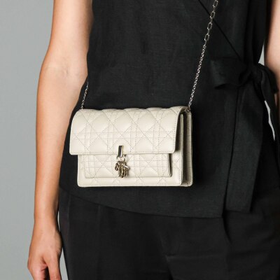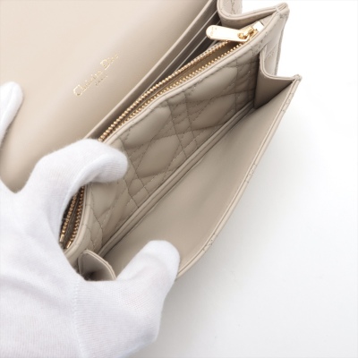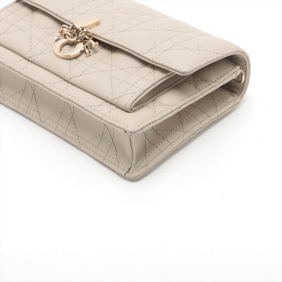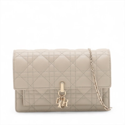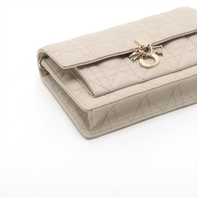 Christian Dior My Dior daily pouch with chain in sand-coloured Cannage Lambskin. Featuring light gold-toned hardware, D.I.O.R. charms at front. Magnetic button on flap opens to an exterior flat pocket and fabric lining main compartment with zip pocket, slip pocket and 6 card slots. Approximate dimensions: 19.5cm(W) x 12.5cm(H) x 4.5cm(D), 55cm jewel shoulder chain drop. Accompanied by Dior dust bag. With Entrupy Certificate of Authenticity. (Pre-owned)