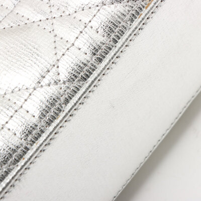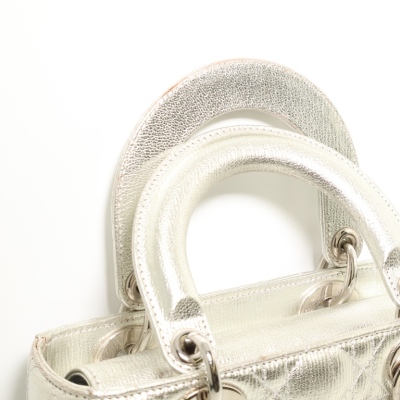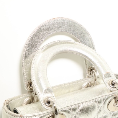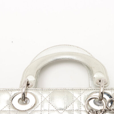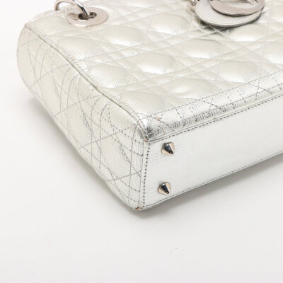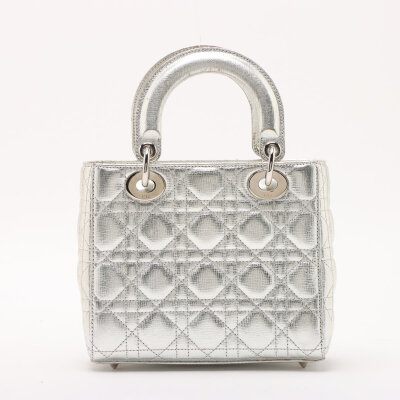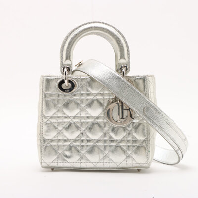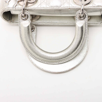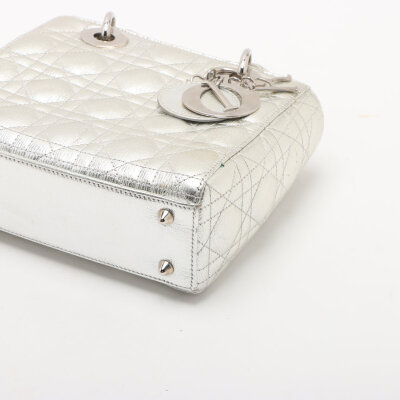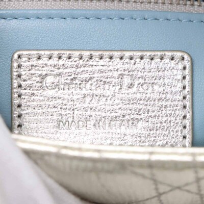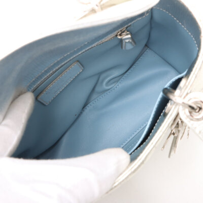Christian Dior small My Lady ABCDior in iridescent silver Cannage quilted leather (circa: 2017). Featuring silver-toned hardware, leather top handles, 'DIOR' charms at front, and a detachable shoulder strap. The top flap opens to a baby blue Cannage fabric interior with a patch and zippered pocket. Approximate dimensions: 20cm(W) x 17cm(H) x 8cm(D), with a 8.5cm handle drop and 50cm adjustable strap drop. Includes three MyABC CD-star-heart charms. With Entrupy Certificate of Authenticity.