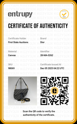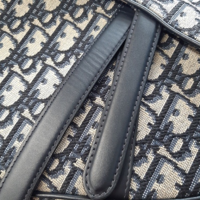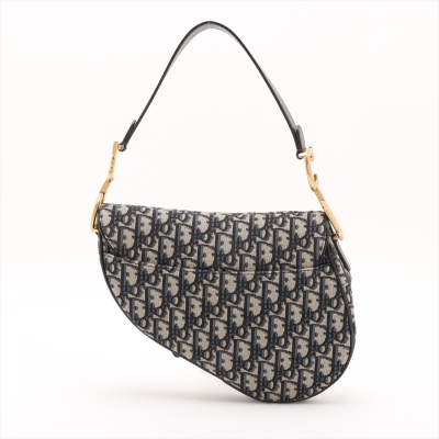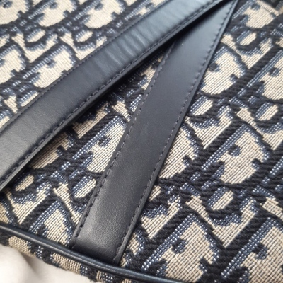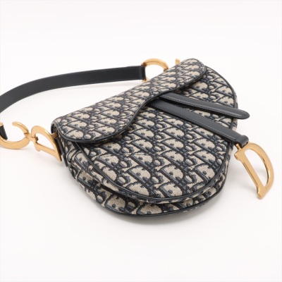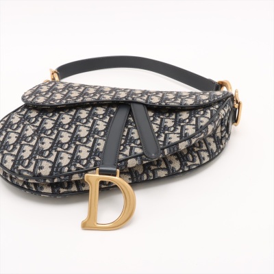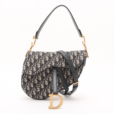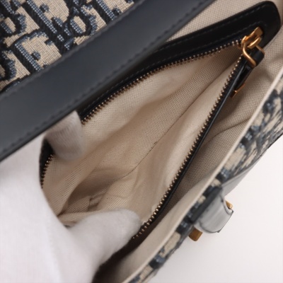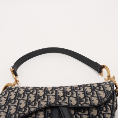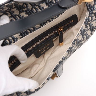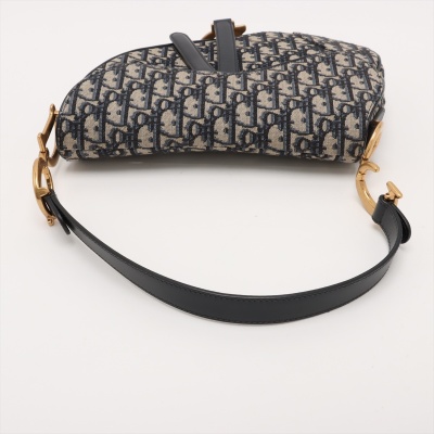 Christian Dior Oblique Saddle in beige & navy Dior Monogram canvas. Featuring aged gold-tone hardware, navy leather trims, exterior back pocket & a single flat top handle with CD signature links on each side. The front flap with stirrup strap & magnetic closure opens to a beige textile interior with a zip pocket. Approx. dimensions: 24cm(T-L) x 20cm(H) x 6cm(D), 5.5cm handle drop, 19.5cm leather strap drop, adjustable. With Entrupy Certificate of Authenticity. (Pre-owned)