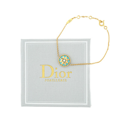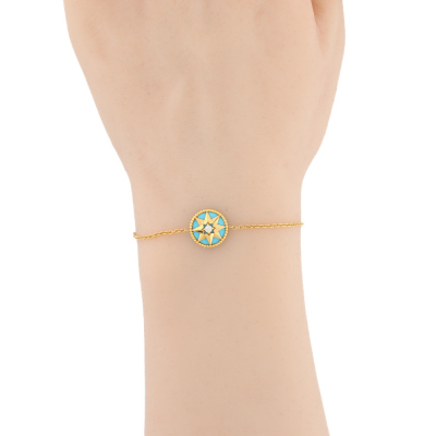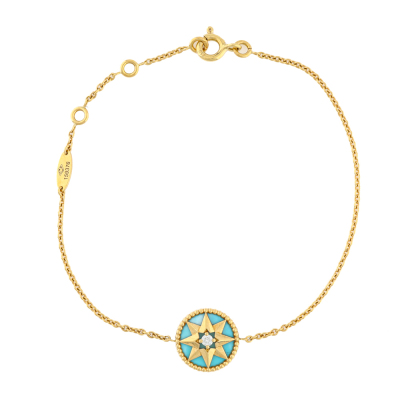 Christian Dior Rose des Vents bracelet with Turquoise inlay and a round Natural Diamond of 0.04ct. Motif diameter: 12mm. 18ct yellow gold. Adjustable length: 14.5cm, 16cm & 17.5cm. Weight: 2.7g. With Christian Dior box & Christian Dior authenticity card dated 28/07/2019.