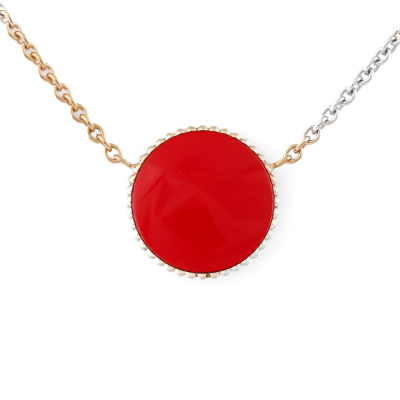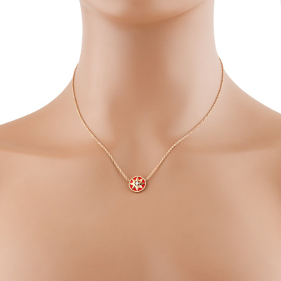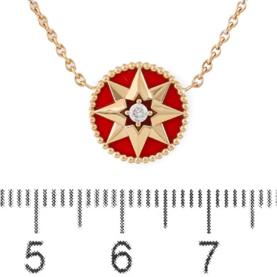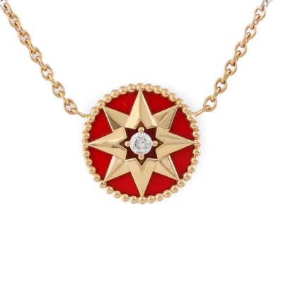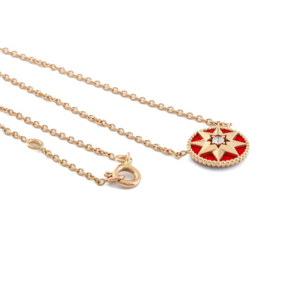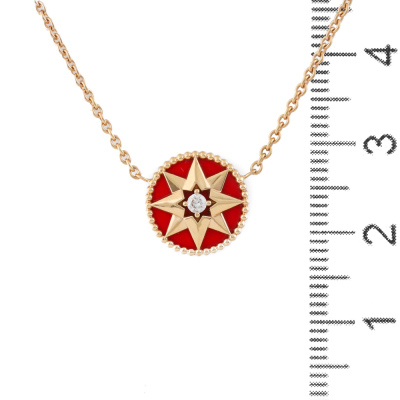 Christian Dior Rose De Vents necklace with a round Natural Diamond of 0.04ct and red ceramic. Motif diameter: 11.8mm. 18ct rose gold attached with 18ct rose gold chain. Adjustable length: 38.5cm - 42.5cm. Weight: 3.8g. (Pre-owned)