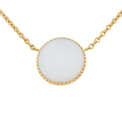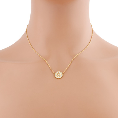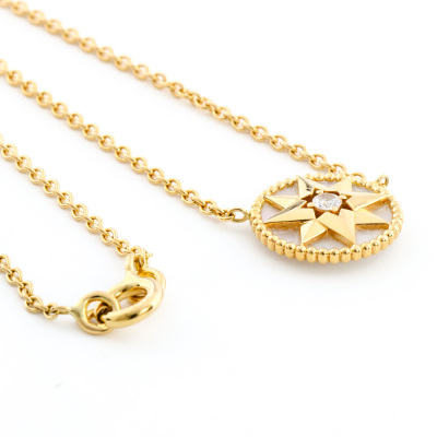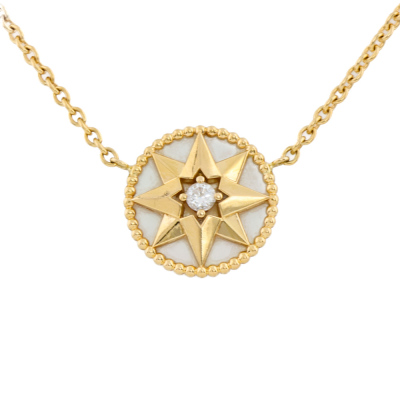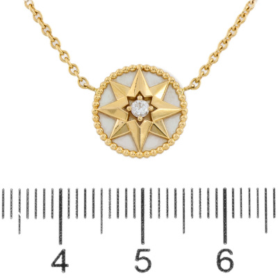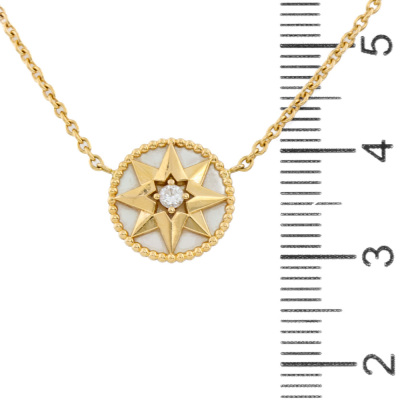 Christian Dior Rose De Vents necklace with a round Natural Diamond of 0.04ct and Mother of Pear inlay. Motif diameter: 12mm. 18ct yellow gold with 18ct yellow gold attached chain. Adjustable length: 38.5cm - 42.5cm. Weight: 4.0g. With Christian Dior inner & outer box. With Christian Dior Certificate dated: 10/08/2018 (Pre-owned)