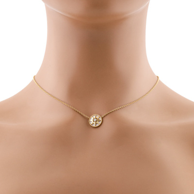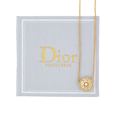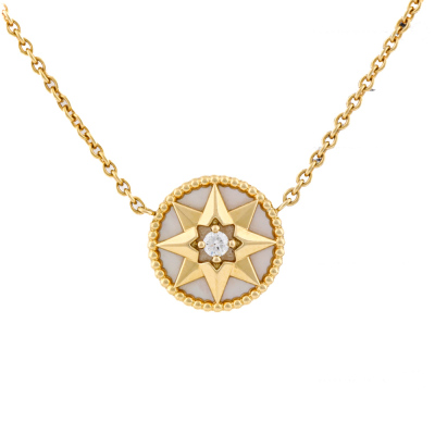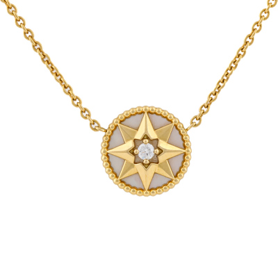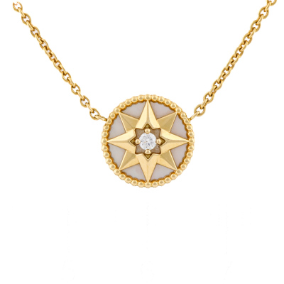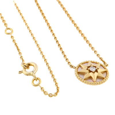 Christian Dior Rose des Vents necklace with Mother of Pearl inlay and a round Natural Diamond of 0.04ct. Motif diameter: 12mm. 18ct yellow gold with Christian Dior 18ct yellow gold attached chain. Adjustable to: 38cm, 40cm & 42cm. Weight: 4.3g. With Christian Dior Certificate dated: 21/07/2019 and Christian Dior box.