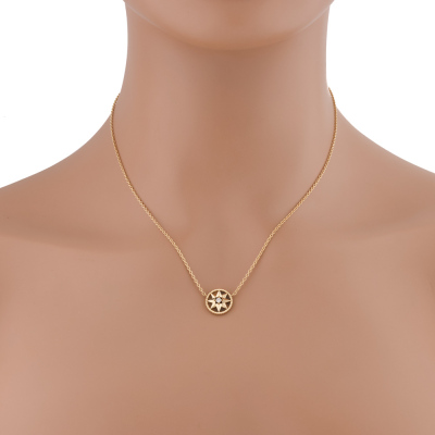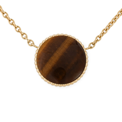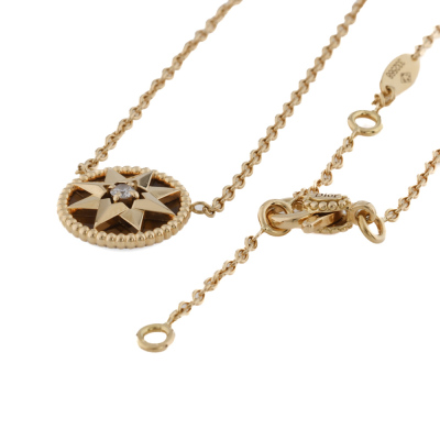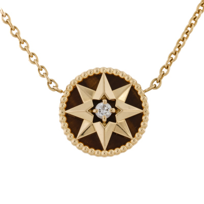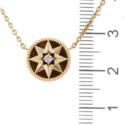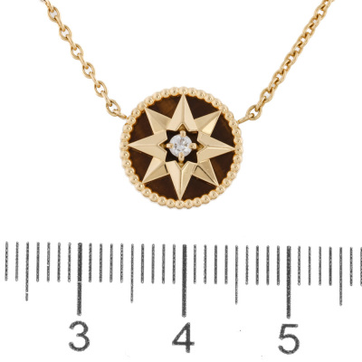 Christian Dior Rose des Vents Necklace with Tiger eye inlay and a round Natural Diamond of 0.04ct. Motif diameter: 12mm. 18ct yellow gold with Christian Dior 18ct yellow gold attached chain. Adjustable length: 39cm, 41cm & 43cm. Weight: 4.6g. With Christian Dior Certificate dated: 05/03/2022 and Christian Dior box.