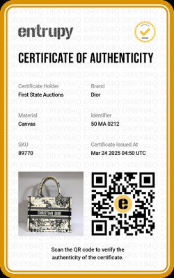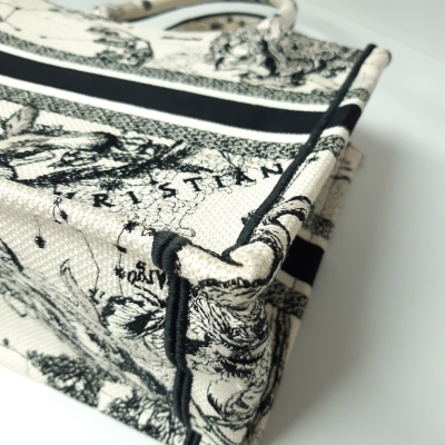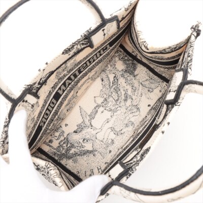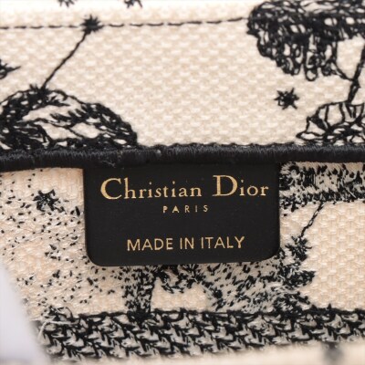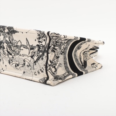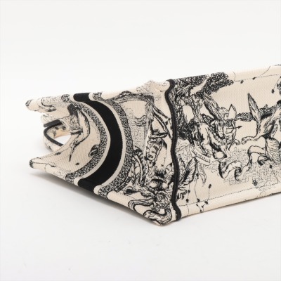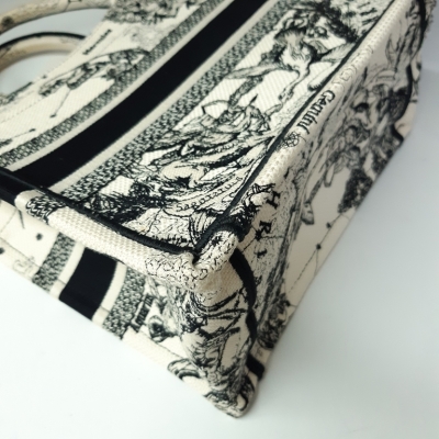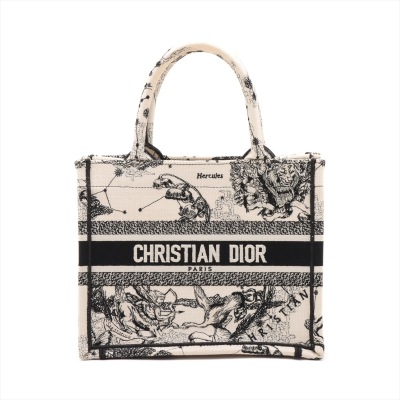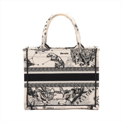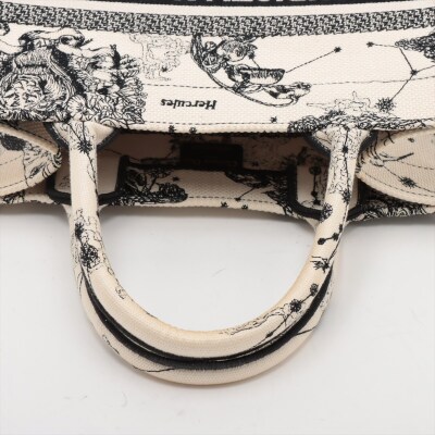 Christian Dior small book tote in embroidered latte and black Dior Zodiac motif. Featuring Christian Dior Paris signature at front, and dual rolled handles. The top opens to a spacious canvas interior. Approximate dimensions: 27cm(L) x 22cm(H) x 14cm(D), handle drop 12cm. Accompanied by Dior dustbag and box. With Entrupy Certificate of Authenticity. (Pre-owned)