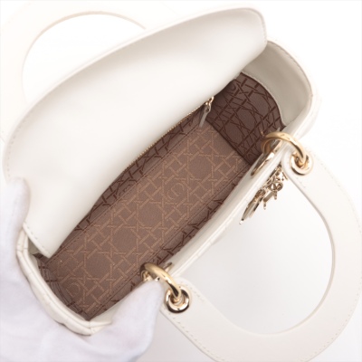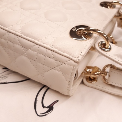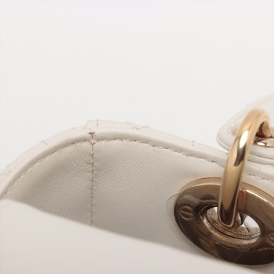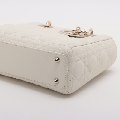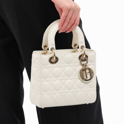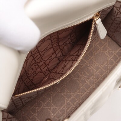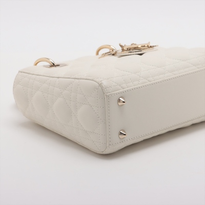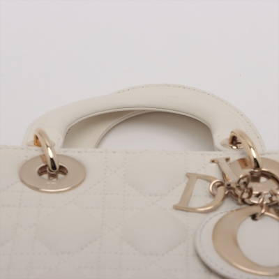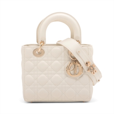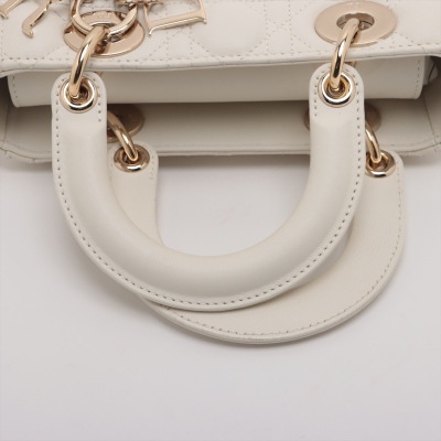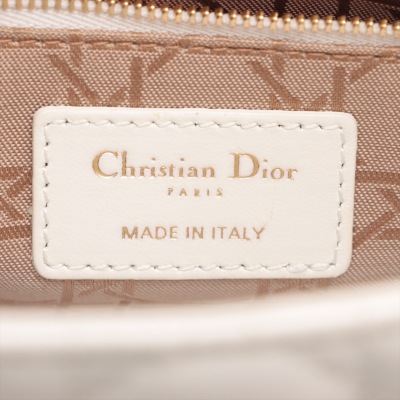 Christian Dior small Lady ABCDior bag in cream white lambskin with Cannage quilting. Featuring light gold-toned hardware, dual leather handles, Dior letter charms, removable shoulder strap with badges. The top flap closure opens to a beige, logo printed fabric lining interior with a zipped and patch pocket. Approx dimensions: 20cm(L) x 17cm(H) x 8.5cm(D), 8.5cm handle drop, 56cm shoulder drop, adjustable. With Dior dustbag & Entrupy Certificate of Authenticity. (Pre-owned)