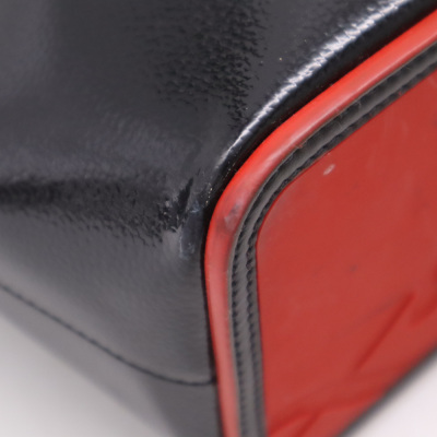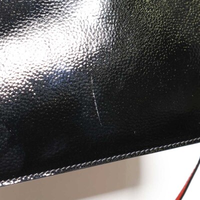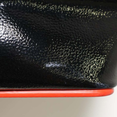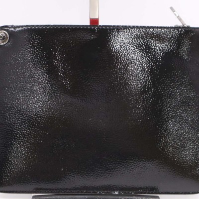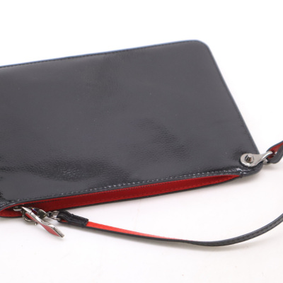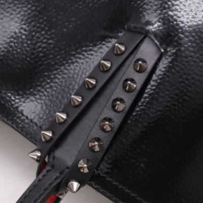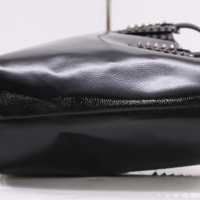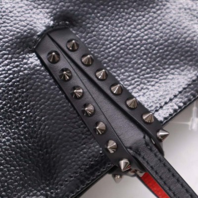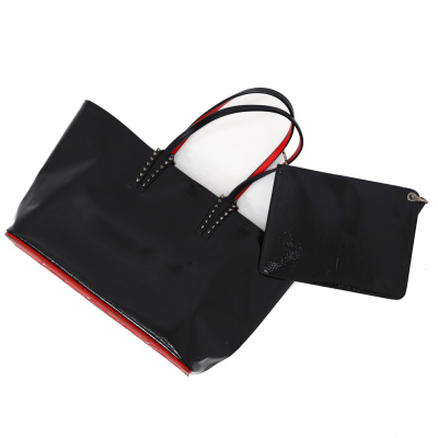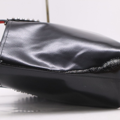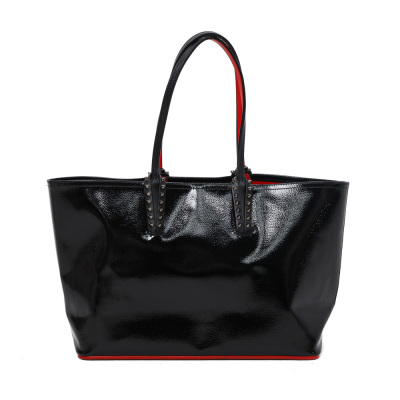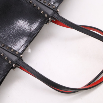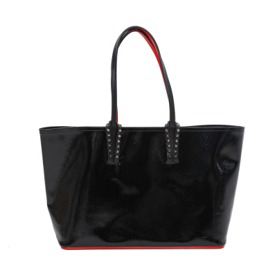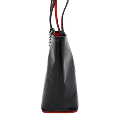Christian Louboutin Cabata tote in black patent calfskin leather. Featuring gunmetal-toned hardware, black spike embellishments, dual flat leather handles, red Louboutin signature sneaker sole, and a removable zippered pouch. The open top with centre hook clasp reveals a red leather lined interior. Approximate dimensions: 33.5cm(W) x 25cm(H) x 12cm(D), with a 20cm handle drop. With Entrupy Certificate of Authenticity.