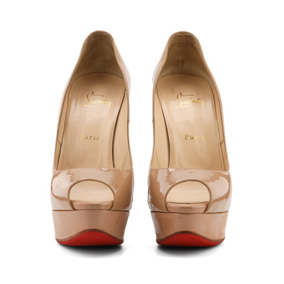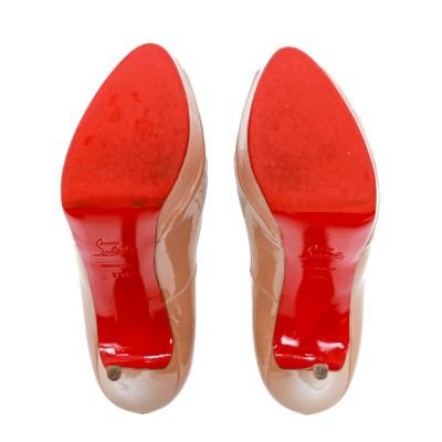 Christian Louboutin Lady Peep 150 Patent. Size EU39.5. Colour code: PK20. Colour: Nude. Heel Height: 150mm. Material: Patent calf leather. Made in Italy. Aftermarket red sole protector added, condition underneath unknown. With Christian Louboutin box. (Pre-owned)*