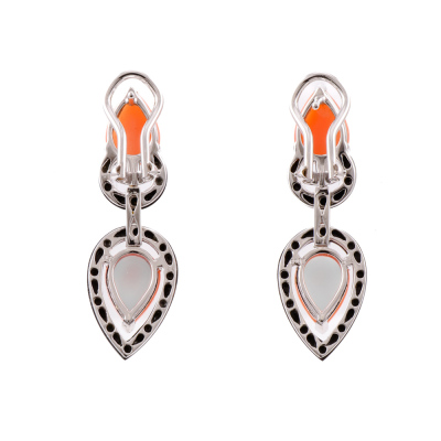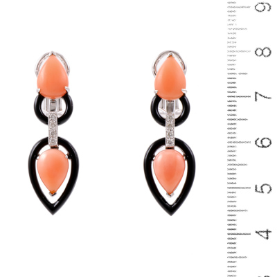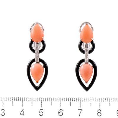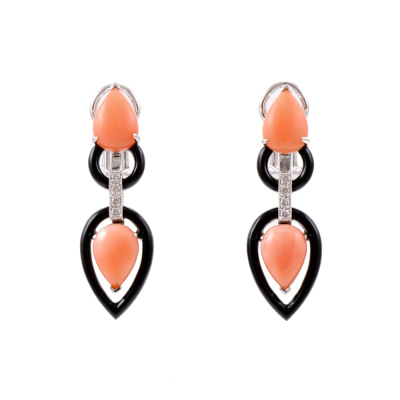 Clip-on earrings (for pieced ears) with pear cabochon cut Coral of size approximately 10.0mm x 7.0mm, round Natural Diamonds totalling 0.09ct and Natural Onyx inlay. 18ct white gold. Weight: 6.9g. (Pre-owned)