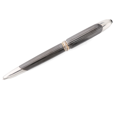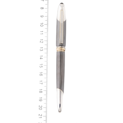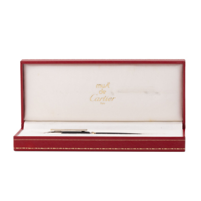 Cougar de Cartier Trinity Ball Pen with Trinity motif and onyx cabochon cap tip. Length: 13.1cm (stored) - Twist to lower ball point. Silver and gunmetal colour. Circa: 1992. Made in France. With Must de Cartier box. Note - no ink cartridge provided. (Pre-owned).