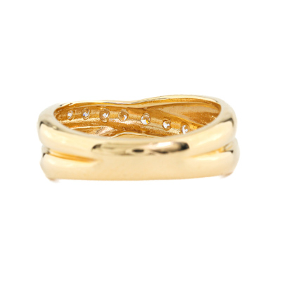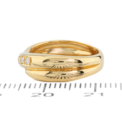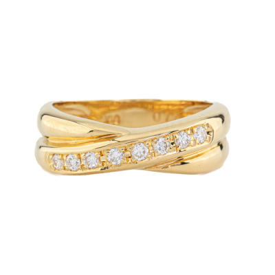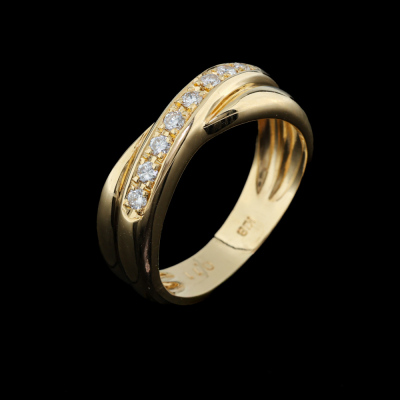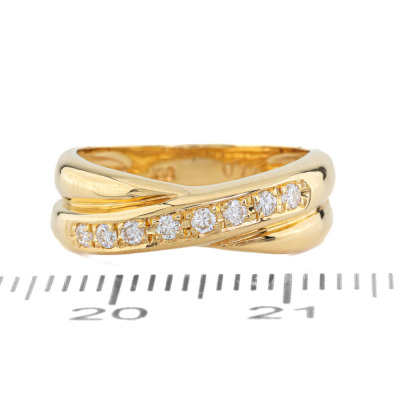 Crossover Diamond ring with 8 round Natural Diamonds totalling 0.11ct. Ring size: F (Note: small ring size). 18ct yellow gold. Band width: 3.5mm - 5.5mm. Weight: 3.9g. (As New)