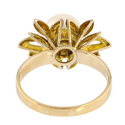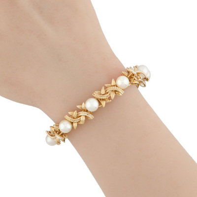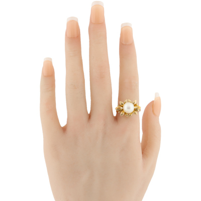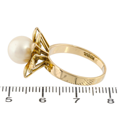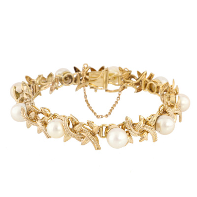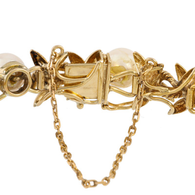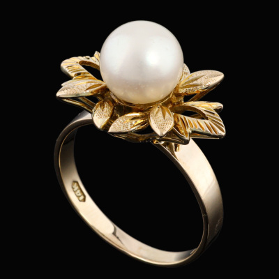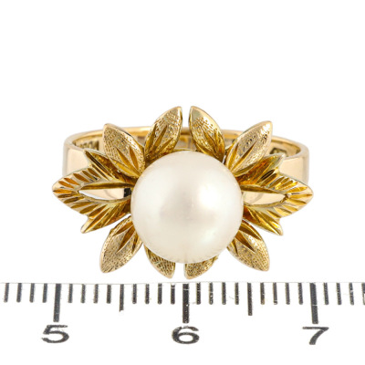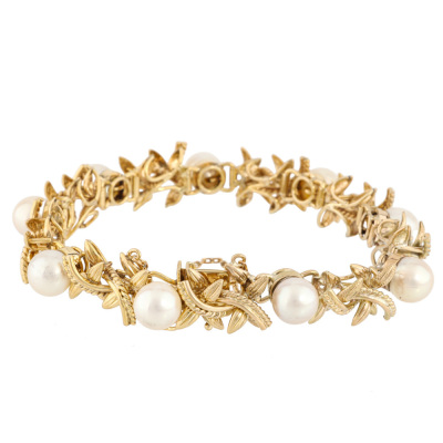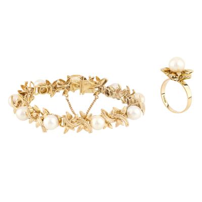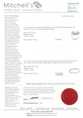 Pearl bracelet and Ring set. 1) Pearl bracelet with 9 Cultured Pearls from 7.7mm - 7.4mm. 14ct yellow gold (XRF tested). Length: 17cm. With 7cm 7ct yellow gold safety chain (XRF tested). 2) Flora design Pearl ring with centre Cultured Pear of 8.7mm. 14ct yellow gold. Ring size: P. Band width: 2.3mm - 362mm. Total Weight: 33.2g. With Valuation Certificate dated 17/06/2025. (Pre-owned)