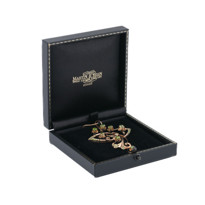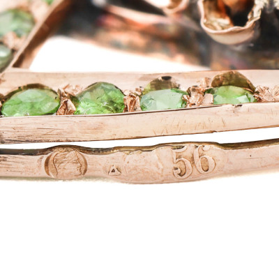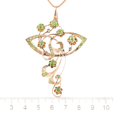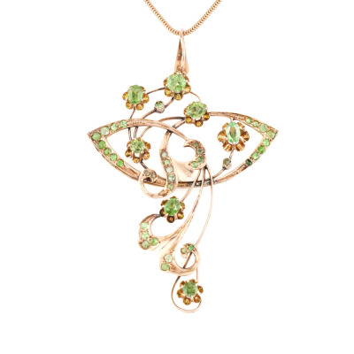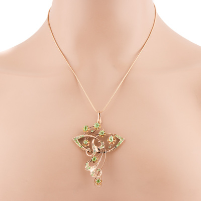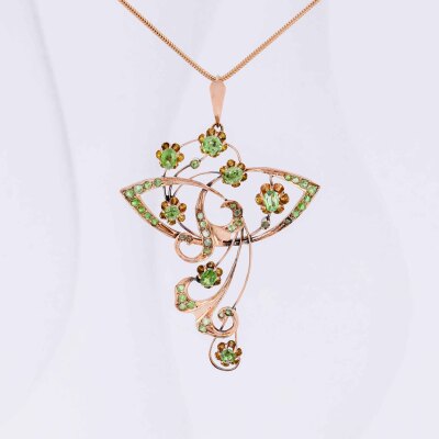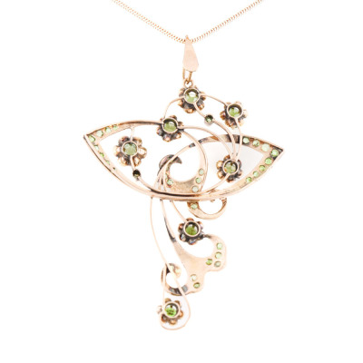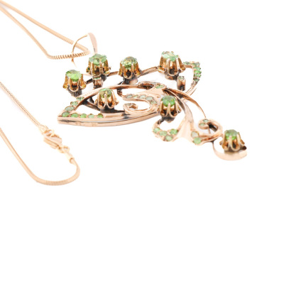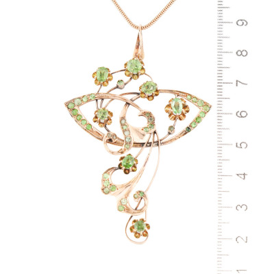 Art Nouveau pendant with 40 round & 4 oval shaped Demantoid Garnets of size 1.8mm - 4.5mm & 4.4 x 3.6mm - 5.6 x 3.8mm. 12ct Rose gold (XRF tested, no stamp) with 45.5cm 18ct Rose gold snake chain. Weight 14.3g. ( Pre-Owned)