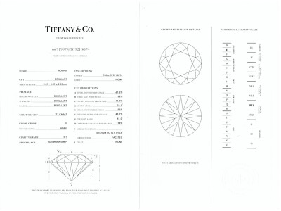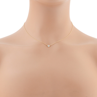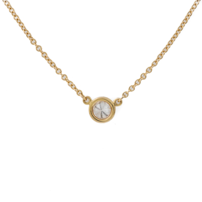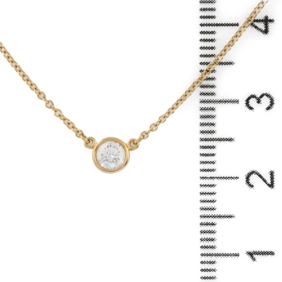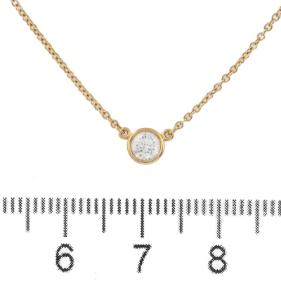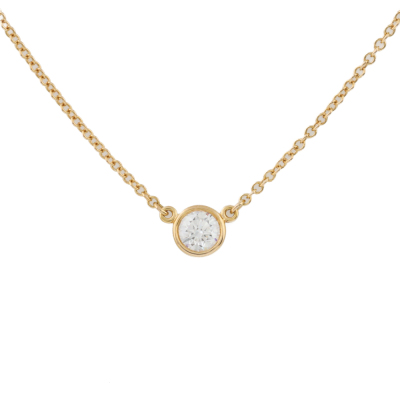 Tiffany & Co Elsa Peretti Diamonds by the Yard single Diamond pendant with a round Natural Diamond of 0.21ct (with Tiffany & Co Diamond Certificate graded as E SI1 #66919978/T09210074). 18ct yellow gold with 18ct yellow gold attached chain. Length: 41cm. Weight: 1.8g. With Tiffany & Co inner, outer box and Tiffany & Co Certificate (Pre-owned)