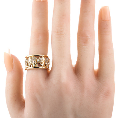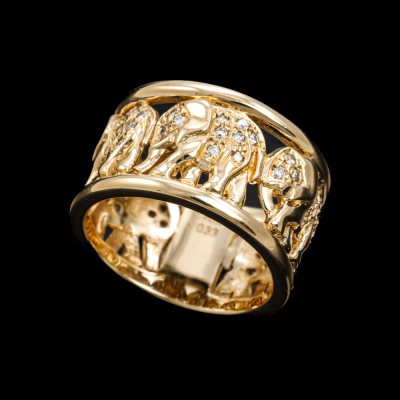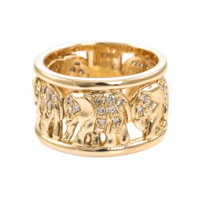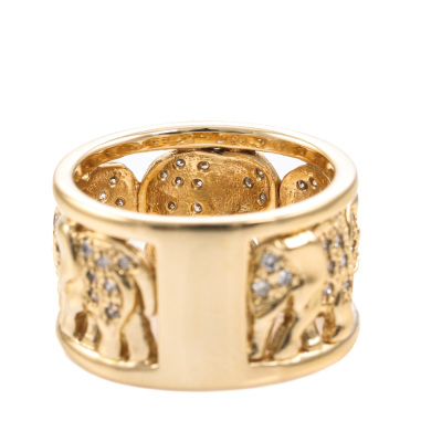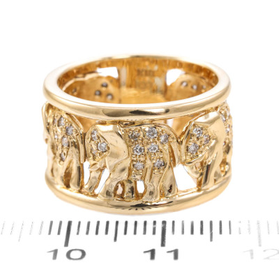 Elephant design wide band ring with round Natural Diamonds totalling 0.33ct (Estimated grading: G SI). 18ct yellow gold. Ring size N - Ring resizing is not recommended. Band width: 12mm. Weight: 11.3g.
