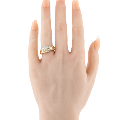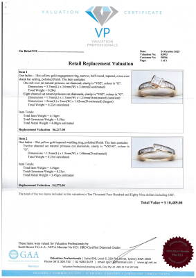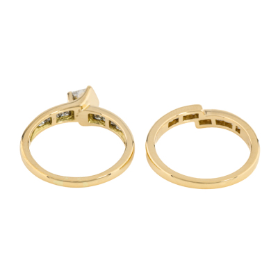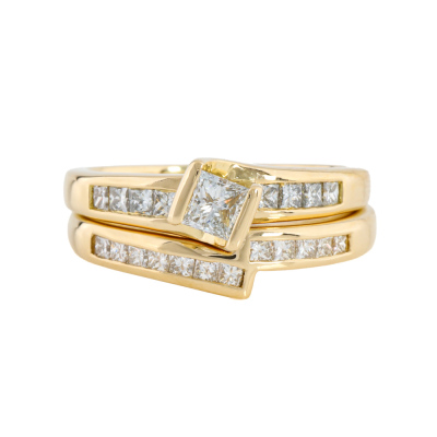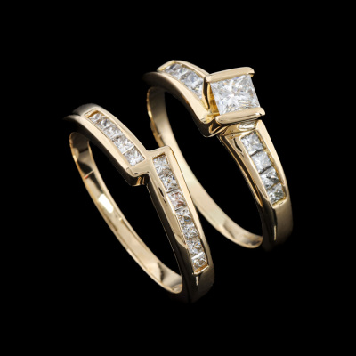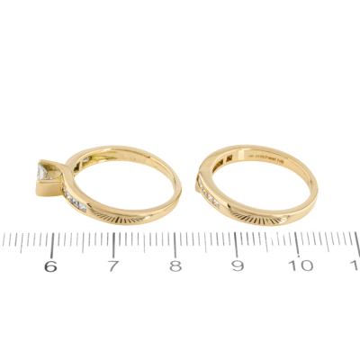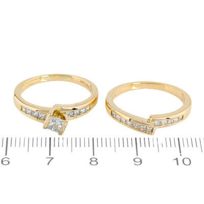 Diamond Engagement ring and matching eternity ring. 1) Diamond engagement ring with a centre princess cut Natural Diamond of 0.28ct (Estimated grading: G VS2) and shoulder princess cut Natural Diamonds totalling 0.22ct. Ring size N. Band width: 1.9mm - 4.0mm. 2) Matching Diamond eternity ring with 12 princess cut Natural Diamonds totalling 0.25ct. Ring size N. Band with: 1.9mm - 3.0mm. Both 18ct yellow gold. Total Weight: 7.6g. With Valuation dated 24/10/2025.