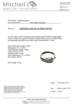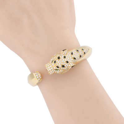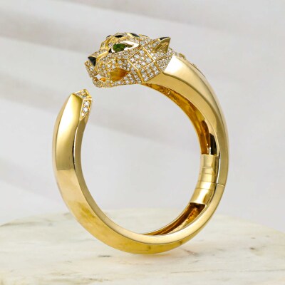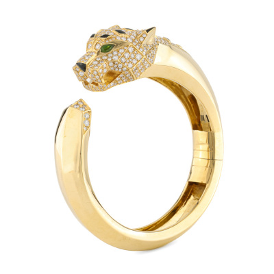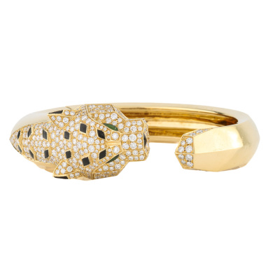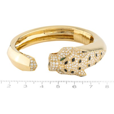 Panther design bangle with round Natural Diamonds totalling approximately 4.00ct (Estimated grading: G VS), 2 pear shape Natural Green Tourmaline totalling 0.06ct and with triangle & parallelogram shape Natural Onyx inlay. 18ct yellow gold. Inner circumference: 15.8cm. Weight: 70.2g. With Certificate #422038. (Pre-owned)