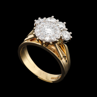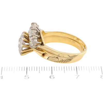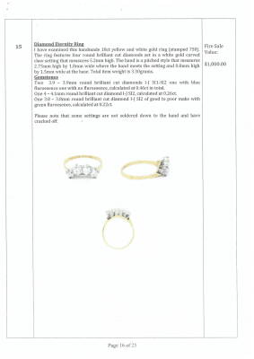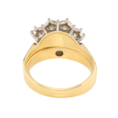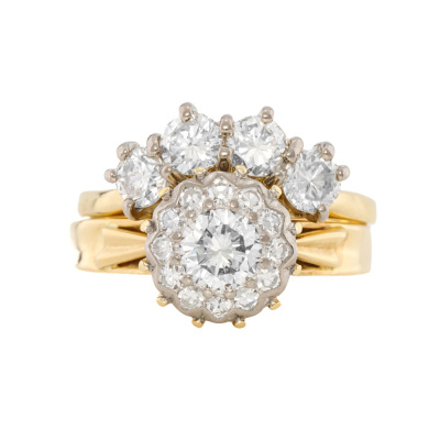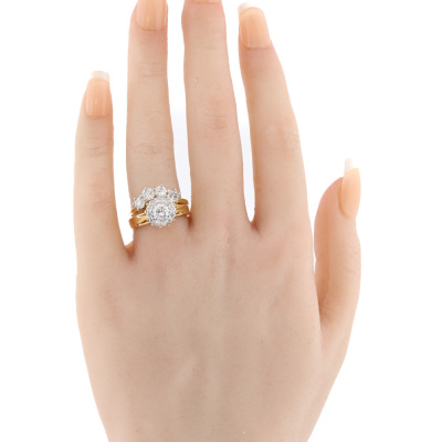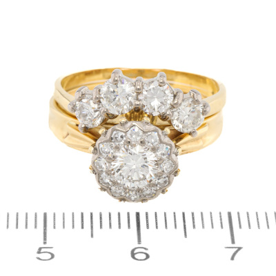 Diamond ring set. 1) Diamond ring with a centre round brilliant cut Natural Diamond of 0.69ct and 12 round Natural Diamonds totalling 0.12ct (Estimated grading for all Diamonds: G VS-SI). 18ct yellow gold & platinum. Ring size N. Band width: 2.2mm - 3.2mm. 2) Matching wadder with 4 round Natural Diamonds totalling 0.94ct (Estimated grading: I-J SI). 18ct yellow & white gold. Ring size P1/2. Band width: 1.5mm - 1.8mm. Total weight: 9.2g. With copy of Valuation Certificate #17 & #15.