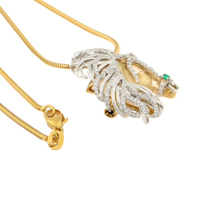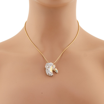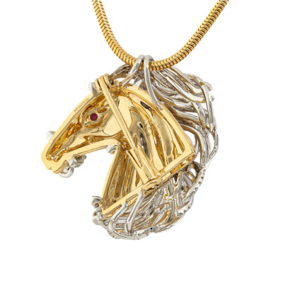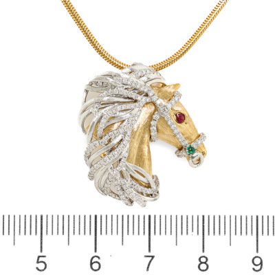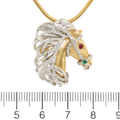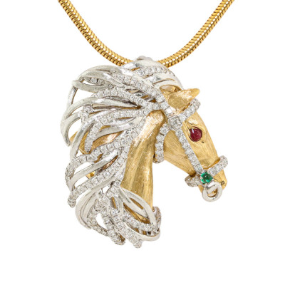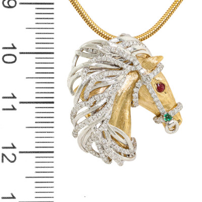 Horse head design pendant/brooch with round Natural Diamonds totalling 0.47ct (Estimated grading: GHI VS-SI) and round cabochon cut Natural Ruby & Natural Emerald totalling 0.049ct. 18ct yellow & white gold with 43cm 18ct yellow gold snake chain. Weight: 14g.