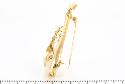 Diamond saxophone design brooch/pendant with round natural Diamonds totalling 0.15ct. 18ct yellow gold. Weight: 13.6g. (Pre-owned)