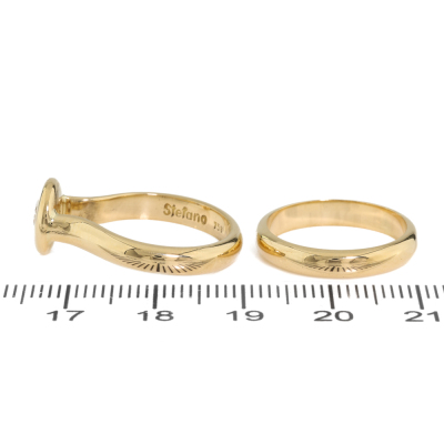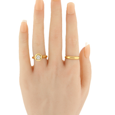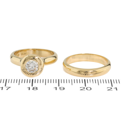 Set of Diamond solitaire ring & 3 wedding bands. 1) Diamond solitaire ring with centre round Natural Diamond of approximately 0.50ct (Estimated grading: H-I VS). Ring size K. 2) 3 gold band rings. Ring size J3/4, K1/2 & K1/2. All rings 18ct yellow gold. All Band widths: 3.5mm. Total weight: 17.9g. With hallmark ' Stefano'. (Pre-owned)