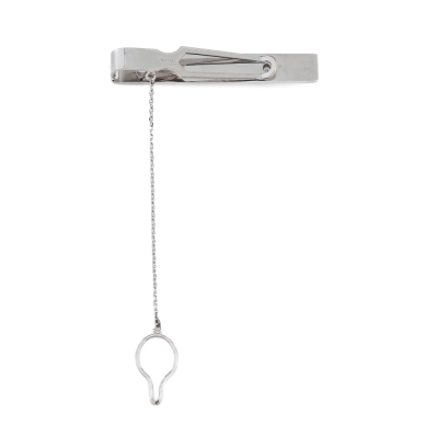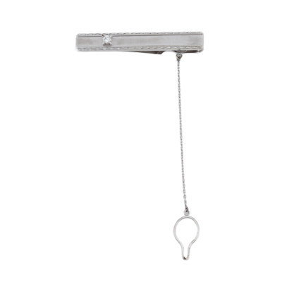 Diamond tie slide with a round Natural Diamond of 0.14ct. 14ct white gold. Length: 5cm. Width: 7.6mm. With safety chain 6.5cm. Weight: 7.0g. (pre-owned)