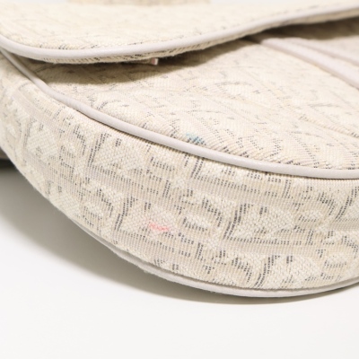 Dior Saddle Bag in beige and white jacquard Dior Oblique motif canvas with white leather trims (circa: 2019). Featuring white & silver-toned hardware, front flap with magnetic button and inner zipper closures open to a black textile interior compartment. Approx dimensions: 27cm(Top-L) x 20cm(H) x 6cm(D), adjustable strap with CD signature aluminium buckle length: 80-106cm. Accompanied by Dior purchase receipt, info booklet, dustbag and box.