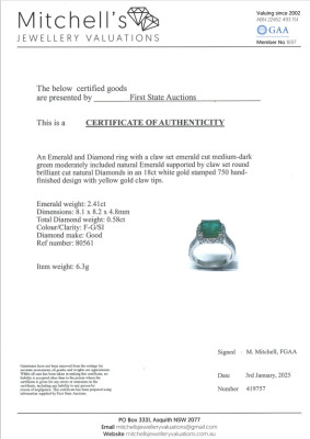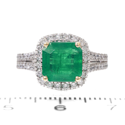 Emerald and Diamond ring with a centre emerald cut Natural Emerald of 2.41ct and round Natural Diamonds 0.58ct (Estimated grading: F-G SI). 18ct yellow and white gold. Ring size L. Band width: 2.5mm - 3.6mm. Weight: 6.3g. With Certificate #419757. (New)