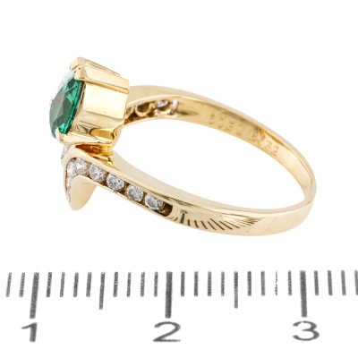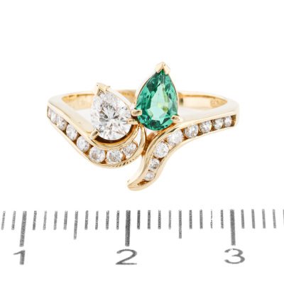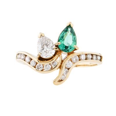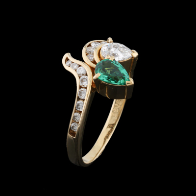 Emerald and Diamond ring with a pear shape Natural Emerald of 0.32ct, pear shape Natural Diamonds totalling 0.31ct (Estimated grading: G VS) and round Natural Diamonds totalling 0.23ct. 18ct yellow gold. Ring size L. Band width: 1.7mm - 2.3mm. Weight: 3.2g. (Pre-owned)