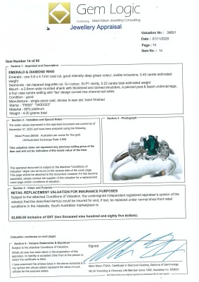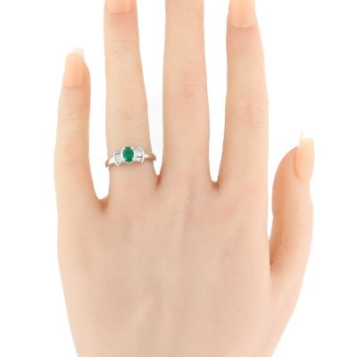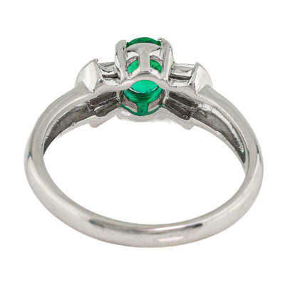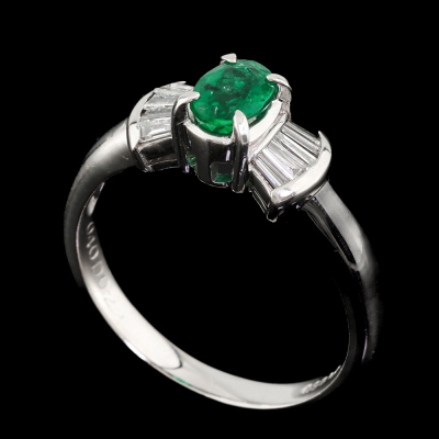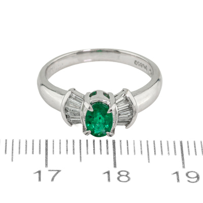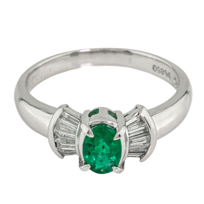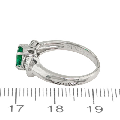 Emerald and Diamond ring with centre oval cut Natural Emerald of 0.40ct and baguette cut Natural Diamonds totalling 0.22ct. Platinum - 850. Ring size K 1/2. band width: 2.2mm - 3.0mm. Weight: 4.0g. With Valuation Certificate dated 07/11/2025. (Pre-owned)