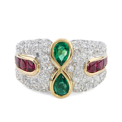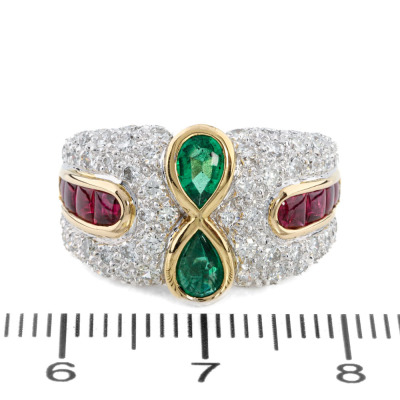 Emerald, Ruby and Diamond ring with centre 2 pear shape puff top Natural Emeralds totalling 0.52ct, 8 square buff top Natural Rubies totalling 0.86ct and round Natural Diamonds totalling 1.07ct (Estimated grading: G-H VS-SI). 18ct yellow & white gold. Ring size K1/4. Band width: 3.9mm - 6.9mm. Weight: 12.2g. (Pre-owned)