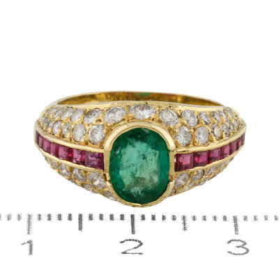 Emerald, Ruby and Diamond ring with centre oval cut Natural Emerald of 0.85ct, carre cut Natural Rubies totalling approximately 0.56ct and round Natural Diamonds totalling approximately 0.84ct (Estimated grading: H-I SI-P1). 18ct yellow gold. Ring size L 1/2. Band width: 3.9mm - 4.7mm. Weight: 6.0g. (Pre-owned)