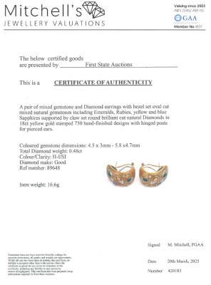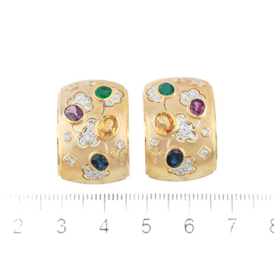 Multi-colour Gemstone and Diamond clip-on earring (for pieced ears) with oval shape Natural Emeralds totalling approximately 0.30ct, Natural Rubies totalling 0.66ct, Natural Yellow & Blue Sapphires totalling approximately 1.7ct and round Natural Diamonds totalling 0.48ct (Estimated grading: H-I SI). 18ct yellow gold with white rhodium plating. Dimension: 2.2cm x 1.7cm. Weight: 16.6g. With Certificate #420185. (Pre-owned)