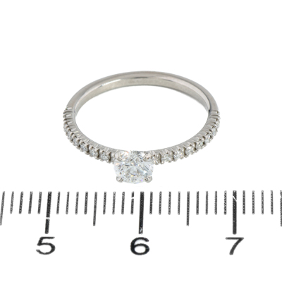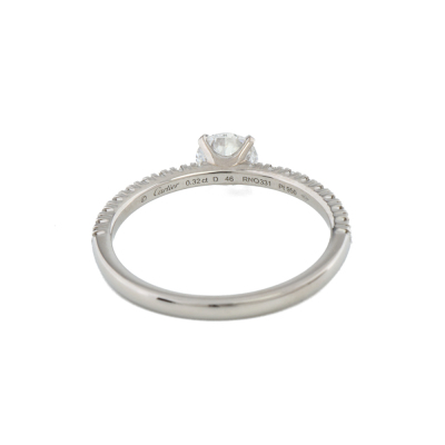 Etincelle De Cartier ring with centre round brilliant cut Natural Diamond of 0.32ct (with copy of GIA graded: D VS1, report #3425215155) and shoulder round Natural Diamonds totalling approximately 0.09ct. Platinum 950. Cartier stamped size 46, measures as Australian size: G - ring resizing is not recommended. Band width: 1.5mm. Weight: 1.8g. With Cartier certificate dated: 17/05/2003. With Cartier inner and outer box. (Pre-owned)