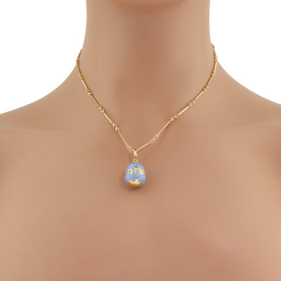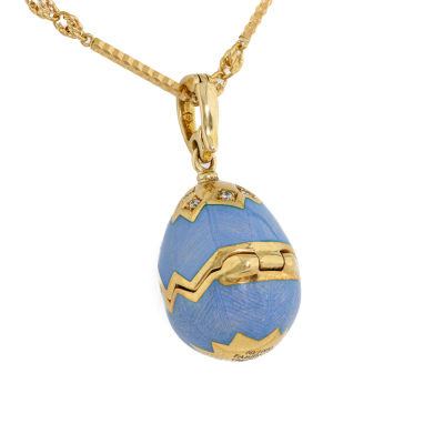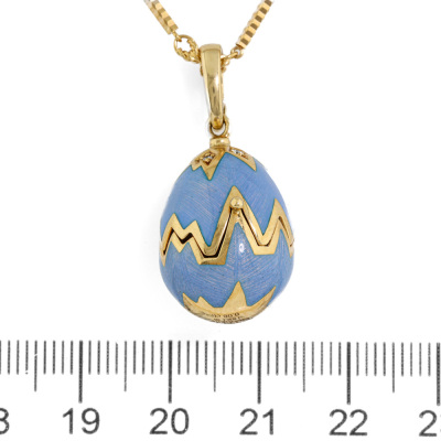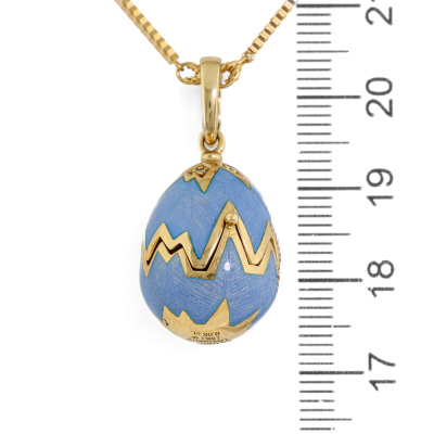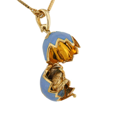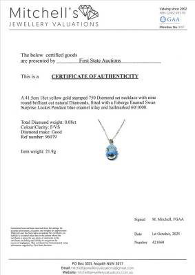 Faberge Enamel Swan Surprise Locket pendant, Limited Edition of 1000. With 8 round Natural Diamonds 0.08ct. The locket opens to reveal a swan. Locket size 23.6mm x 15.6mm. 18ct yellow gold with 41.5cm unbranded 18ct yellow gold chain. Weight: 21.9g. With Certificate #421660. (Pre-owned)
