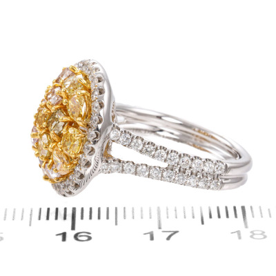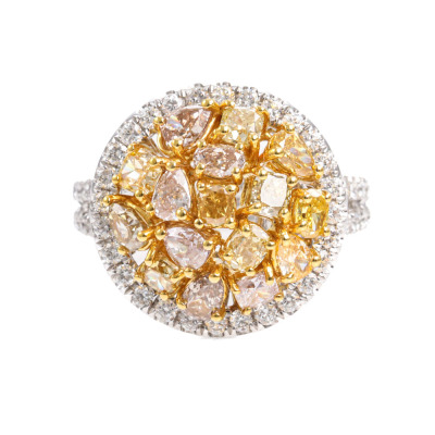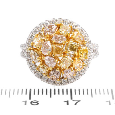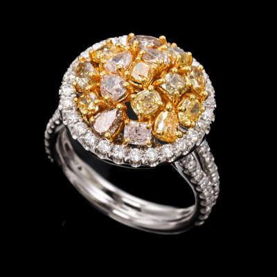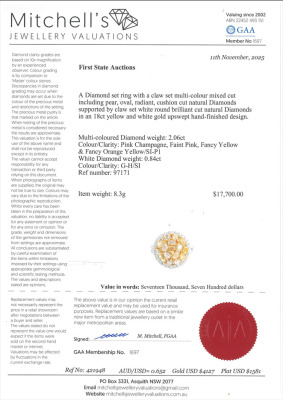 Diamond dress ring with multi-colour mixed cut (including: pear & oval shape and radiant & cushion cut) Natural Diamonds totalling 2.06ct (Estimated grading: Pink Champagne, Faint Pink, Fancy Yellow & Fancy Orange Yellow SI-P1) and surrounding round Natural Diamonds totalling 0.84ct (Estimated grading: G-H SI). 18ct white and yellow gold. Ring size L3/4. Band width: 3.5mm-3.8mm. Weight: 8.3g. With Valuation Certificate #421948. (Pre-owned)