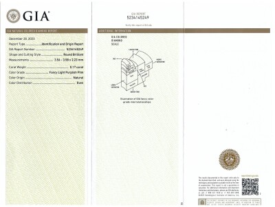 A loose round brilliant cut Natural Diamond of 0.17ct (With GIA Report graded as Natural Fancy Light Purplish Pink, Even #5234145249). (As New)