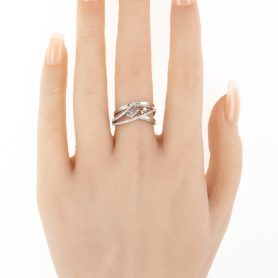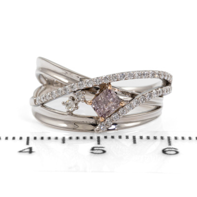 Diamond ring with centre cushion cut natural Pink Diamond of 0.28ct (GSL Report graded as Natural Fancy Purplish Pink P2 #AA69176/6) with surrounding round natural Diamonds totalling 0.25ct. Platinum 950 and 18ct rose gold. Ring size M. Band width 2.5mm - 3.4mm. Weight: 6.4g. (Pre-owned)
