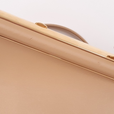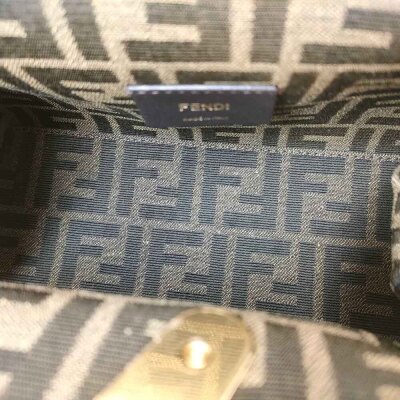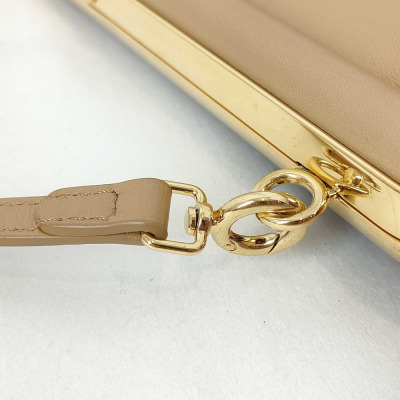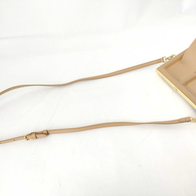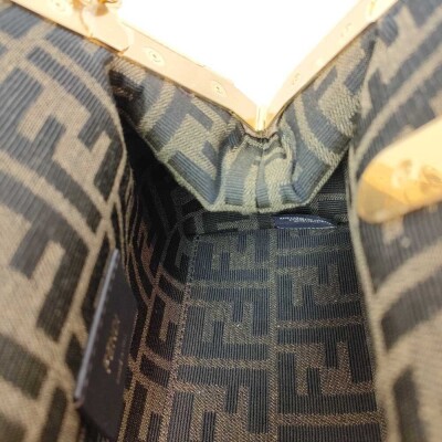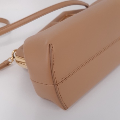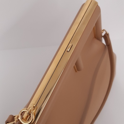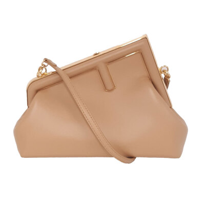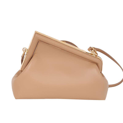 Fendi First small shoulder bag in light brown Nappa leather. Featuring gold-toned hardware, an oversized metal F-shaped clasp with leather bands, and detachable and adjustable shoulder strap. The top opens to a brown interior lined with the Fendi FF fabric jacquard motif. Approximate dimensions: 24cm(Base-L) x 17cm(H) x 9cm(D), strap drop 48cm. With Entrupy Certificate of Authenticity. (Pre-owned)