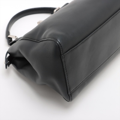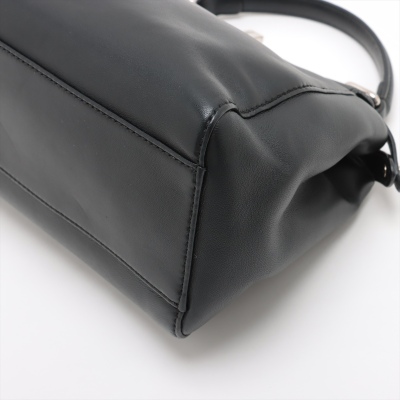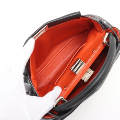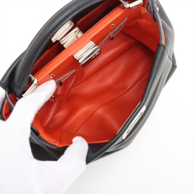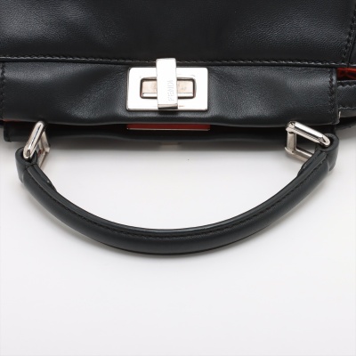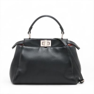 Fendi Mini Peekaboo 2way bag in black Nappa leather. Featuring silver-toned hardware, single flat top handle, and turn-lock closures on front and back. This opens to a red leather interior with two compartments with zip and patch pockets. Approximate dimensions: 24cm(Base-L) x 16cm(H) x 12cm(D), handle drop 8cm, detachable and adjustable shoulder strap drop 66cm. With Entrupy Certificate of Authenticity. (Pre-owned)