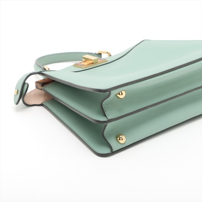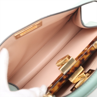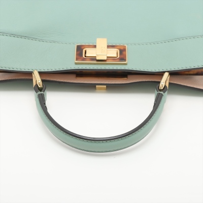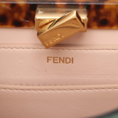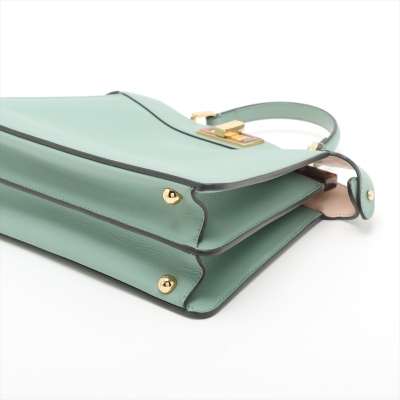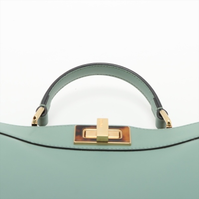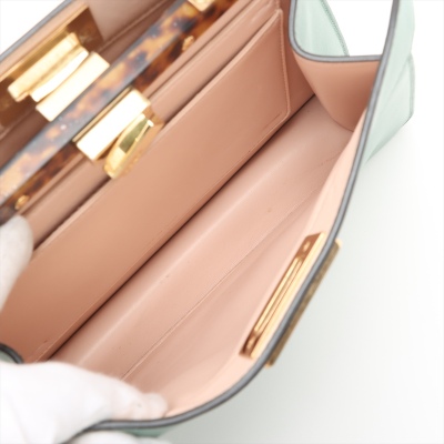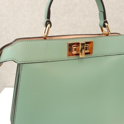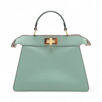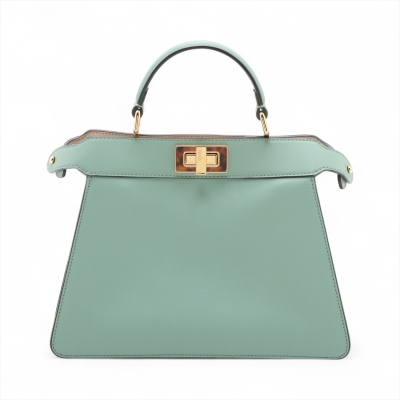 Fendi small Peekaboo ISeeU handbag in light green leather. Featuring gold-toned & Plexiglass hardware, single flat handle, and classic twist-lock closures at front and back. The top opens to light pink nappa leather lining two compartments separated by a stiff partition. Approx dimensions: 27cm(B-L) x 21cm(H) x 11(D), handle drop 7cm. Note: shoulder strap NOT included. With Entrupy Certificate of Authenticity. (Pre-owned)