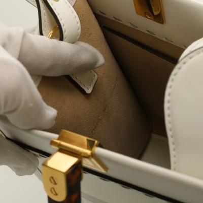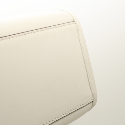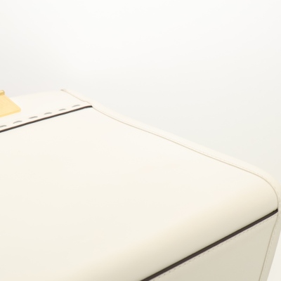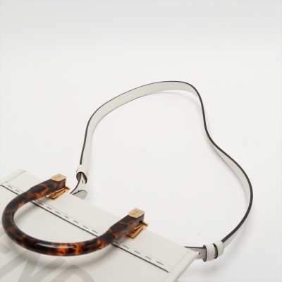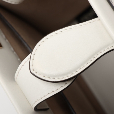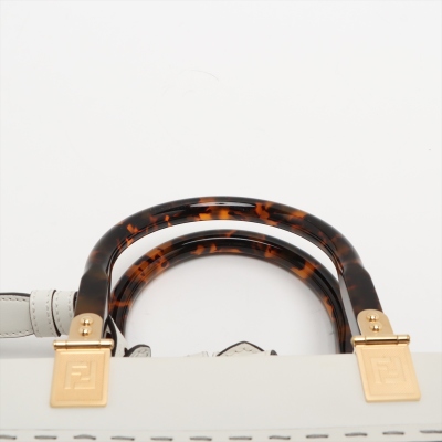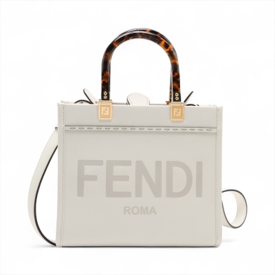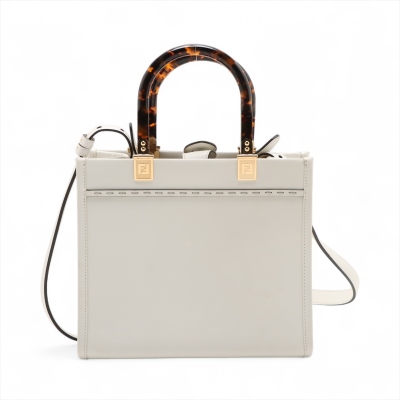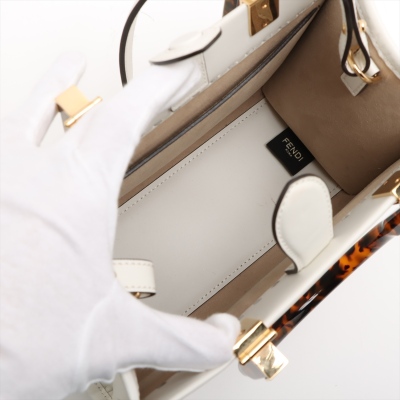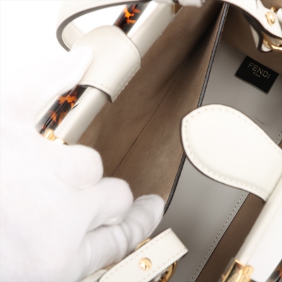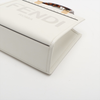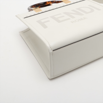 Fendi small Sunshine handbag in white smooth calfskin leather. Featuring gold-toned hardware, an embossed Fendi logo at front, dual tortoiseshell top handles, and a detachable shoulder strap. The top with magnetic button opens to a beige microfibre interior with a patch pocket and white leather base interior. Approximate dimensions: 25cm(L) x 21cm(H) x 12cm(D), 11cm handle drop, and a 50cm adjustable strap drop. With Entrupy Certificate of Authenticity. (Pre-owned)
