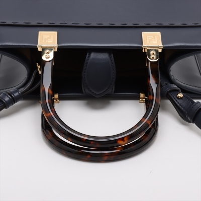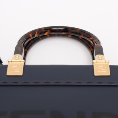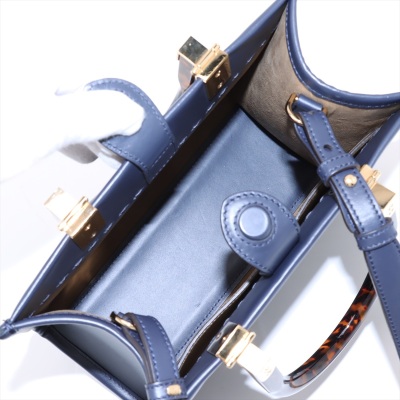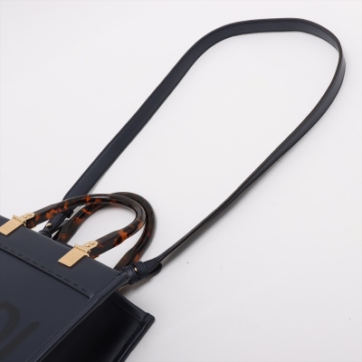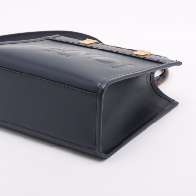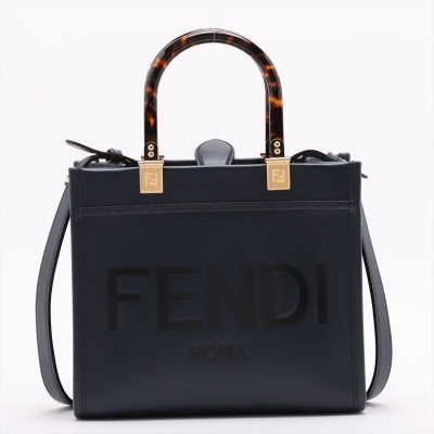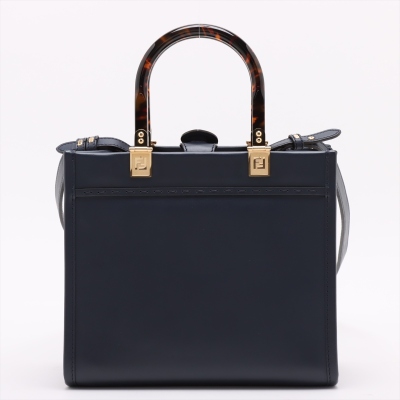 Fendi small Sunshine handbag in navy blue smooth calfskin leather. Featuring gold-toned hardware, an embossed Fendi logo at front, dual tortoiseshell top handles, and a detachable leather shoulder strap. The top with magnetic closure opens to a tonal microfibre interior with a navy blue leather bottom and a patch pocket. Approximate dimensions: 25cm(L) x 22cm(H) x 12cm(D), handle drop 11cm, strap drop 51cm. Accompanied by a Fendi dustbag and box. With Entrupy Certificate of Authenticity. (Pre-owned)